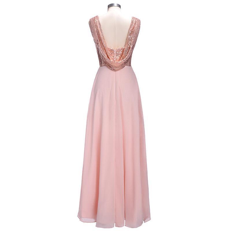 Rose Gold A Line Spaghetti Straps Prom Gowns Backless Sequined Chiffon Bridesmaid Dress OKI10